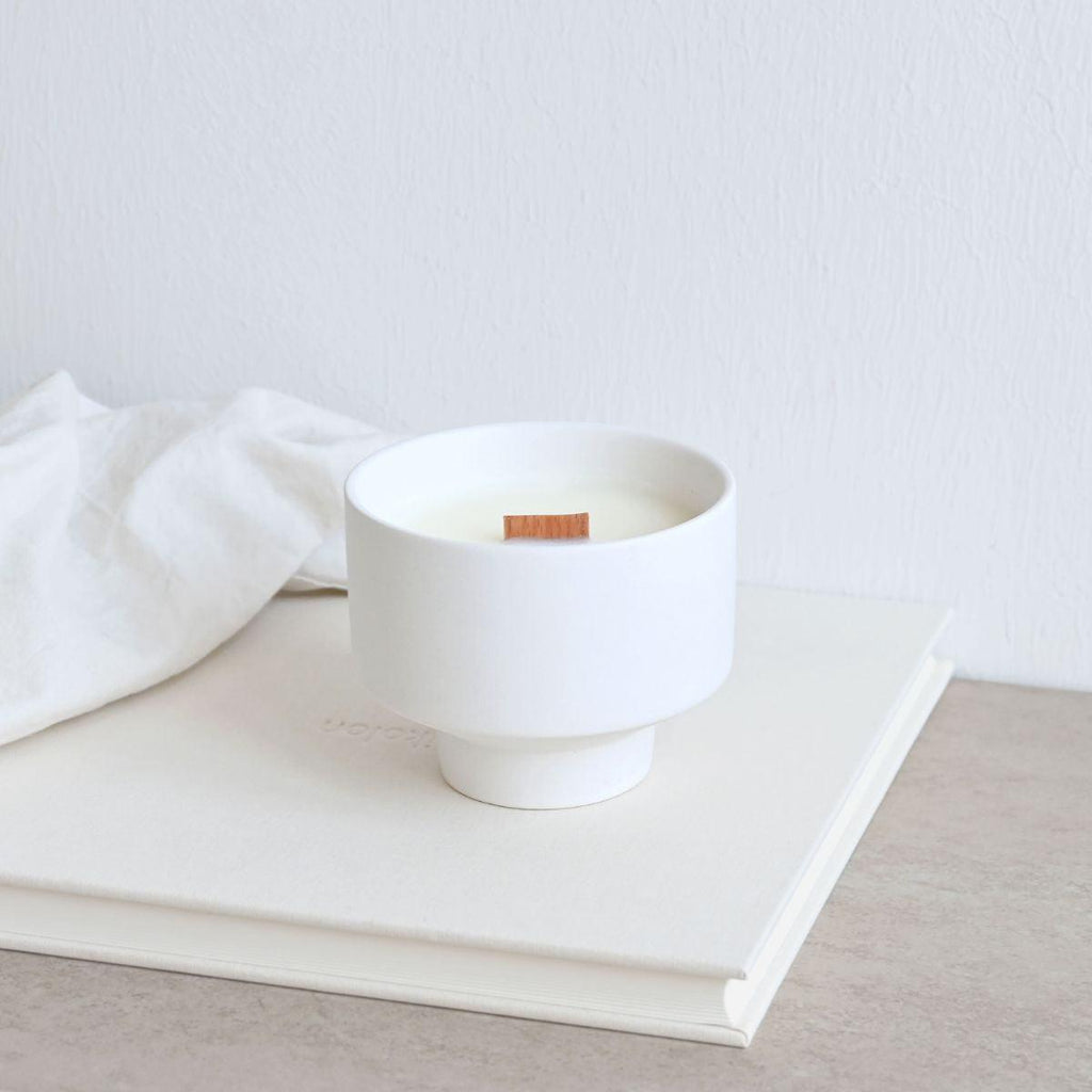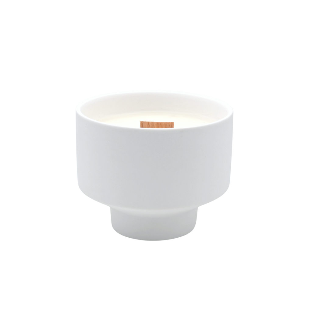 • Stilvolle weiße Duftkerze mit Holzdocht